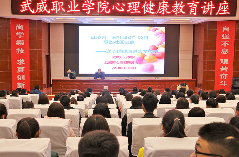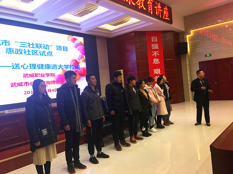 12月4日晚上,學生工作處聯合武威市“三社聯動”惠政社區試點項目在學院菁英廳舉辦了心理健康專題講座暨心理信息員培訓。此次講座邀請武威市心理咨詢師協會會長何飛老師主講,學院各系輔導員、2017級、2018級班級心理信息員、心翼心理社團會員等220多人聆聽了講座。學生工作處處長王守云主持活動。