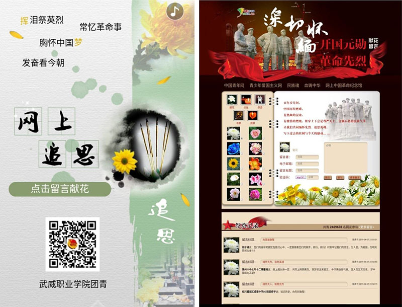 院團委在“武威職業學院團青”微信公眾平臺開設清明網上祭英烈專欄,共有3968名同學參與了線上活動。同學們帶著誠摯的敬意向烈士們鞠躬、獻花,并在留言區發表祭掃寄語,以此緬懷先烈的豐功偉績,追憶烈士之德。