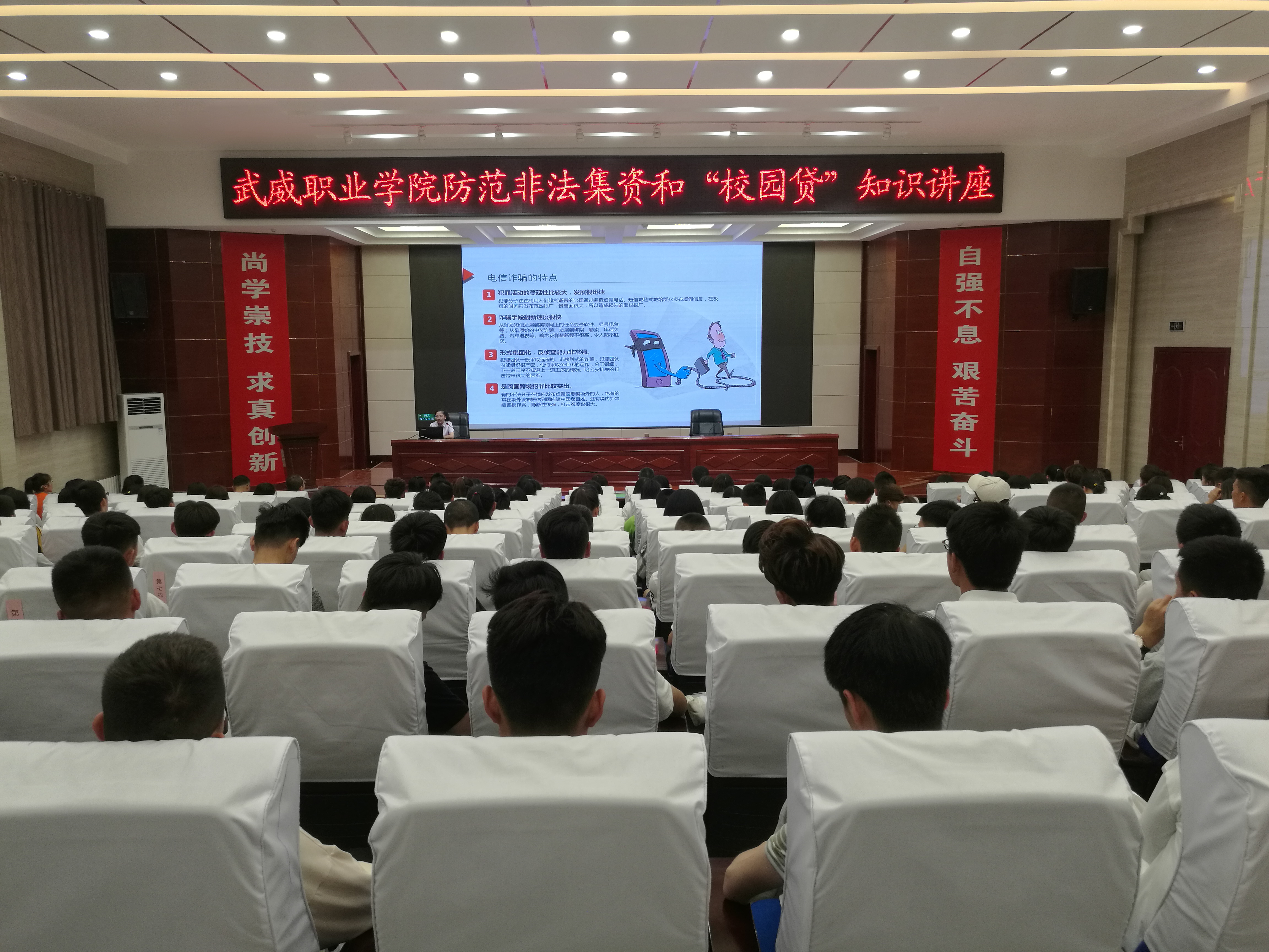 為深入貫徹落實甘肅省2019年防范非法集資和金融領域掃黑除惡宣傳月活動的有關精神,保護廣大師生的合法權益。6月9日晚,學院邀請中國農業銀行武威支行風險管理部工作人員朱琳在菁英廳作了關于防范非法集資和校園貸知識講座,學院副院長王永緒出席活動,保衛處、計劃財務處負責同志及各系師生代表200余人聆聽了講座。