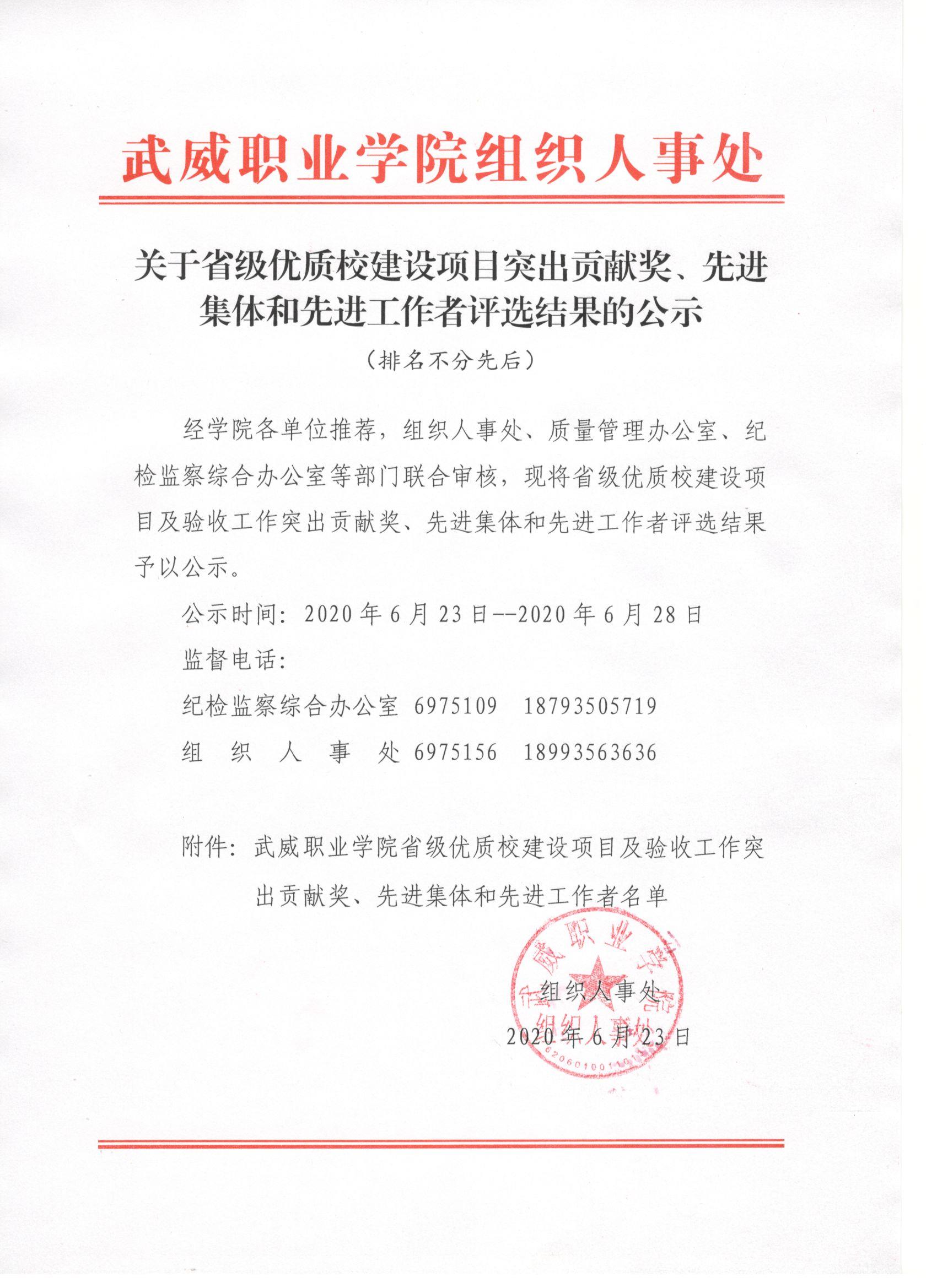 關于省級優質校建設項目突出貢獻獎、先進集體和先進工作者評選結果的公示