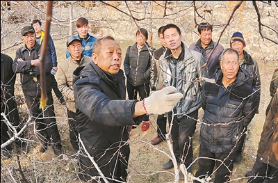 ⑦ 李保國(前左)在河北省內丘縣崗底村向村民講解果樹修剪知識(1月27日攝)。