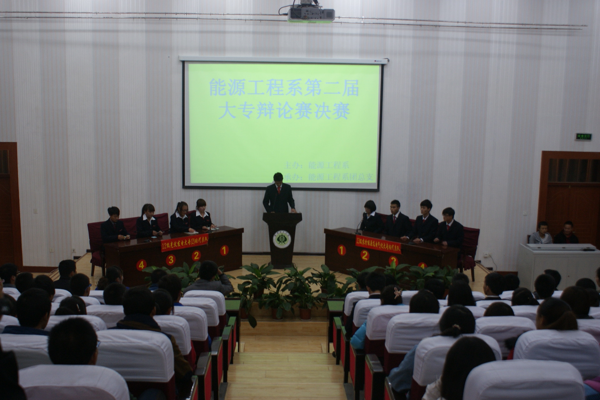 11月10日晚,能源工程系在東階梯教室成功舉辦了能源工程系第二屆大專生辯論賽三、四名和冠、亞軍爭奪戰。能源工程系全體老師和大一、大二學生共270人參加了本次決賽。本次比賽在班級初賽的基礎上有8支代表隊的32名選手代表班級參加了全系比賽,經過系部復賽、半決賽兩個階段的激烈競爭,最終有四支代表隊晉級決賽。