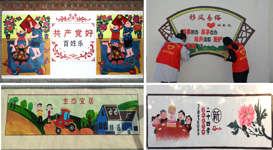 自2019 年以來,武威職業學院堅持“立足地方、融入地方、服務地方”的發展理念,將優勢學科專業與武威市經濟社會發展緊密結合,組織師生開展“打造人文美居助力鄉村振興”墻體彩繪志愿服務項目,通過墻體彩繪反映黨的領導下農村精神風貌的變化和取得的成就,將村莊重點街巷屋面墻體繪制出一幅幅反映美麗鄉村建設、社會主義核心價值觀、移風易俗、鄉風文明等為主題的墻體畫,形象生動、 通俗易懂的內容讓村民變“被動學”為“主動看”,不僅展現了農村新生活、農業新氣象、農民新面貌,美化了村容村貌,為美麗鄉村建設、人居環境美化添磚加瓦。