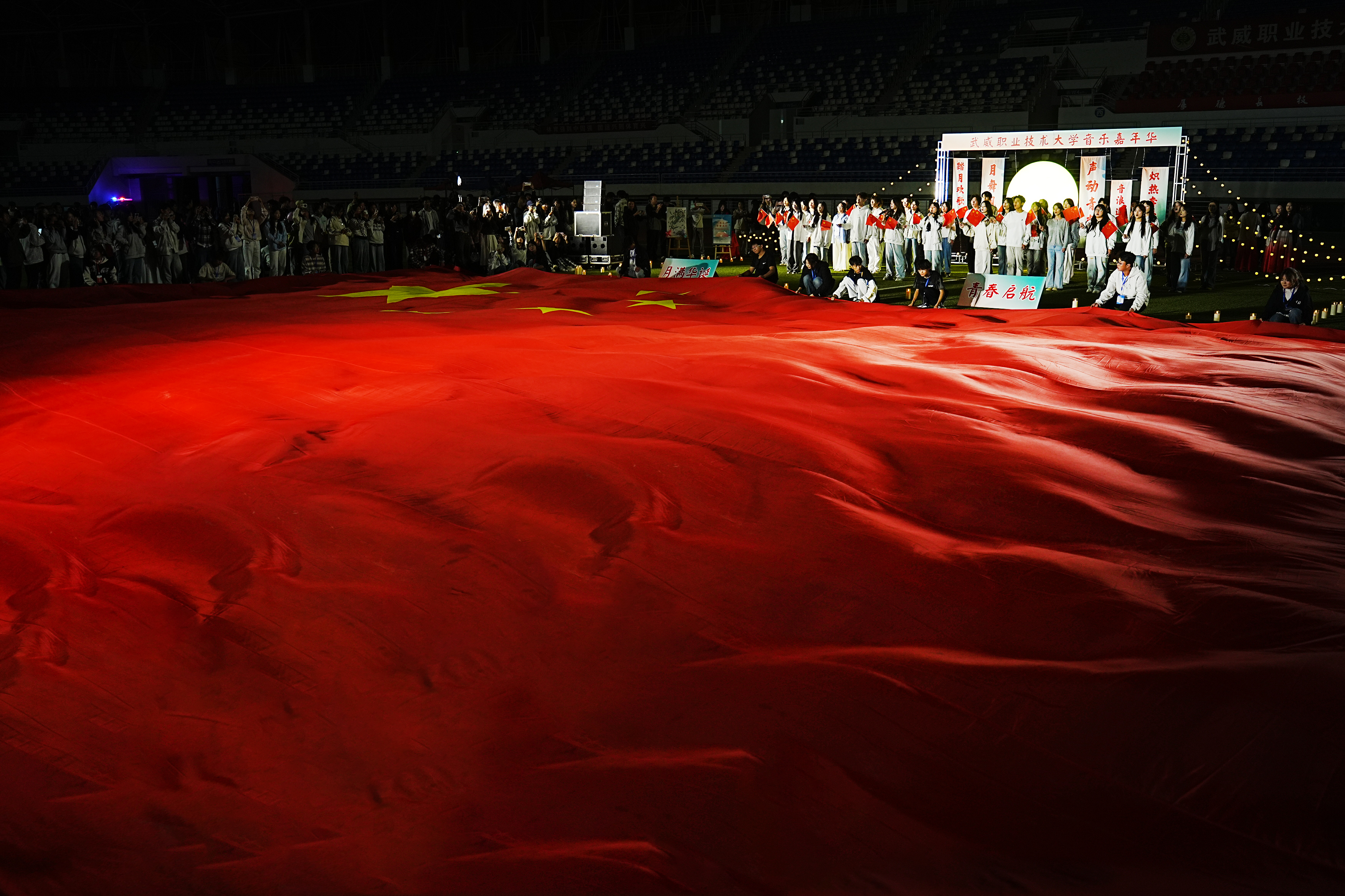 活動尾聲,在深情的旋律中,演職人員與觀眾齊聲合唱《如愿》,深切表達對國泰民安的美好祝愿。巨幅國旗在師生手中緩緩傳遞、飄揚舞動,匯成一片莊嚴而溫暖的紅色海洋,將現場氛圍推向最高潮,展現出青年一代與時代同頻、與祖國同行的堅定信念。