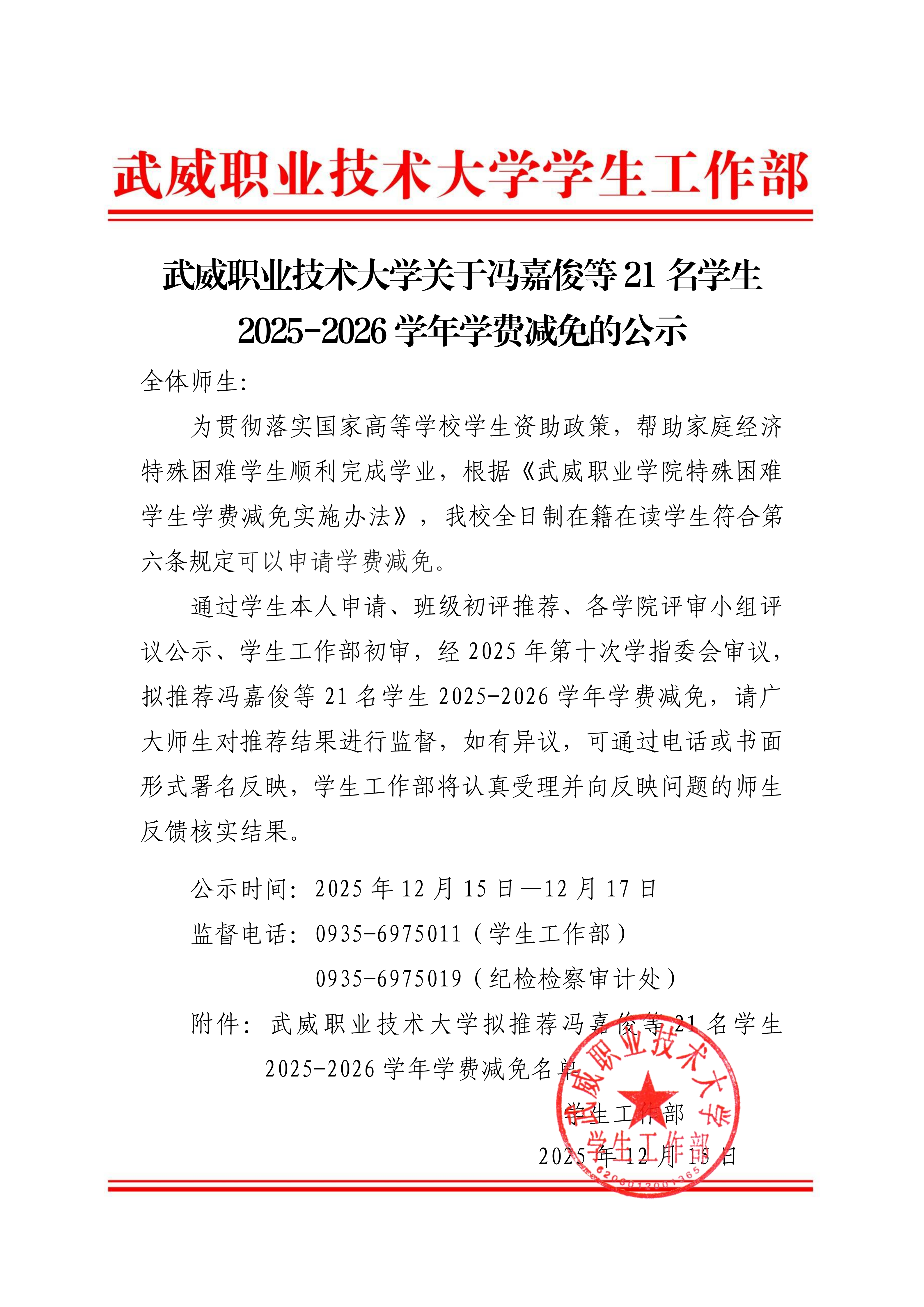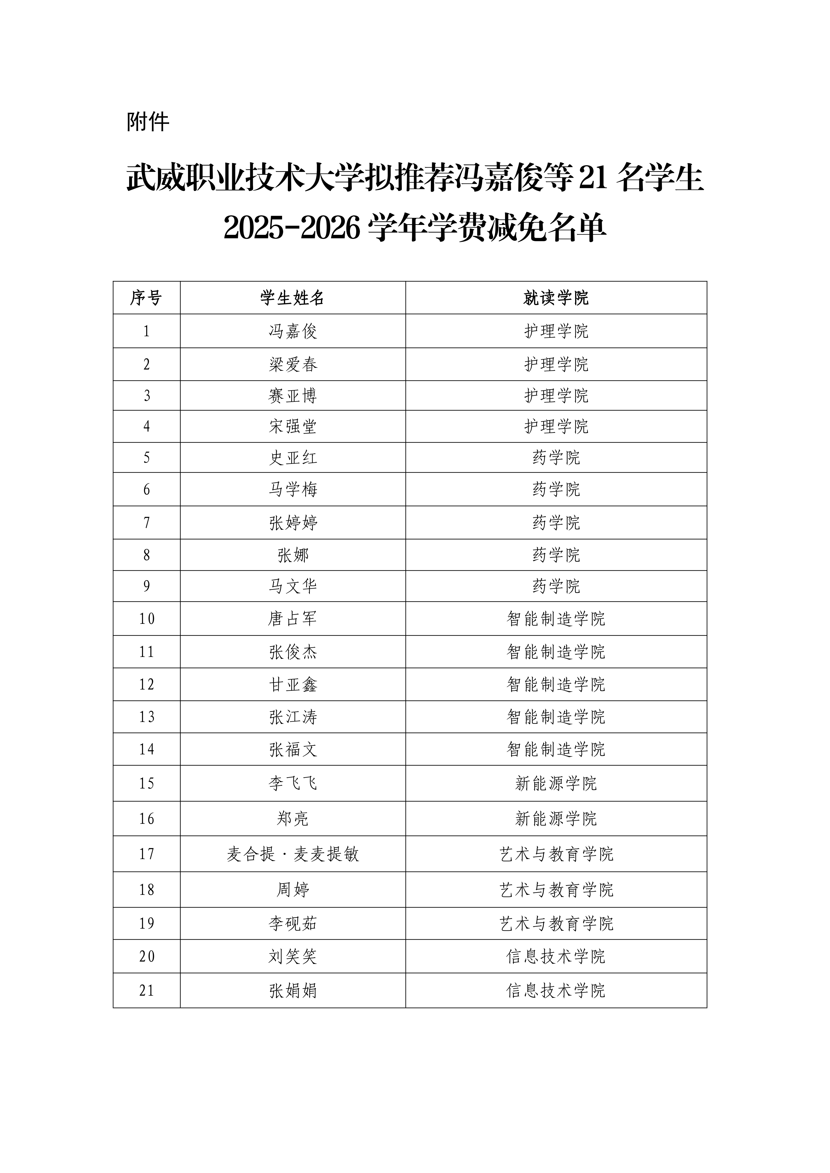 武威職業技術大學關于馮嘉俊等21名學生2025-2026學年學費減免的公示