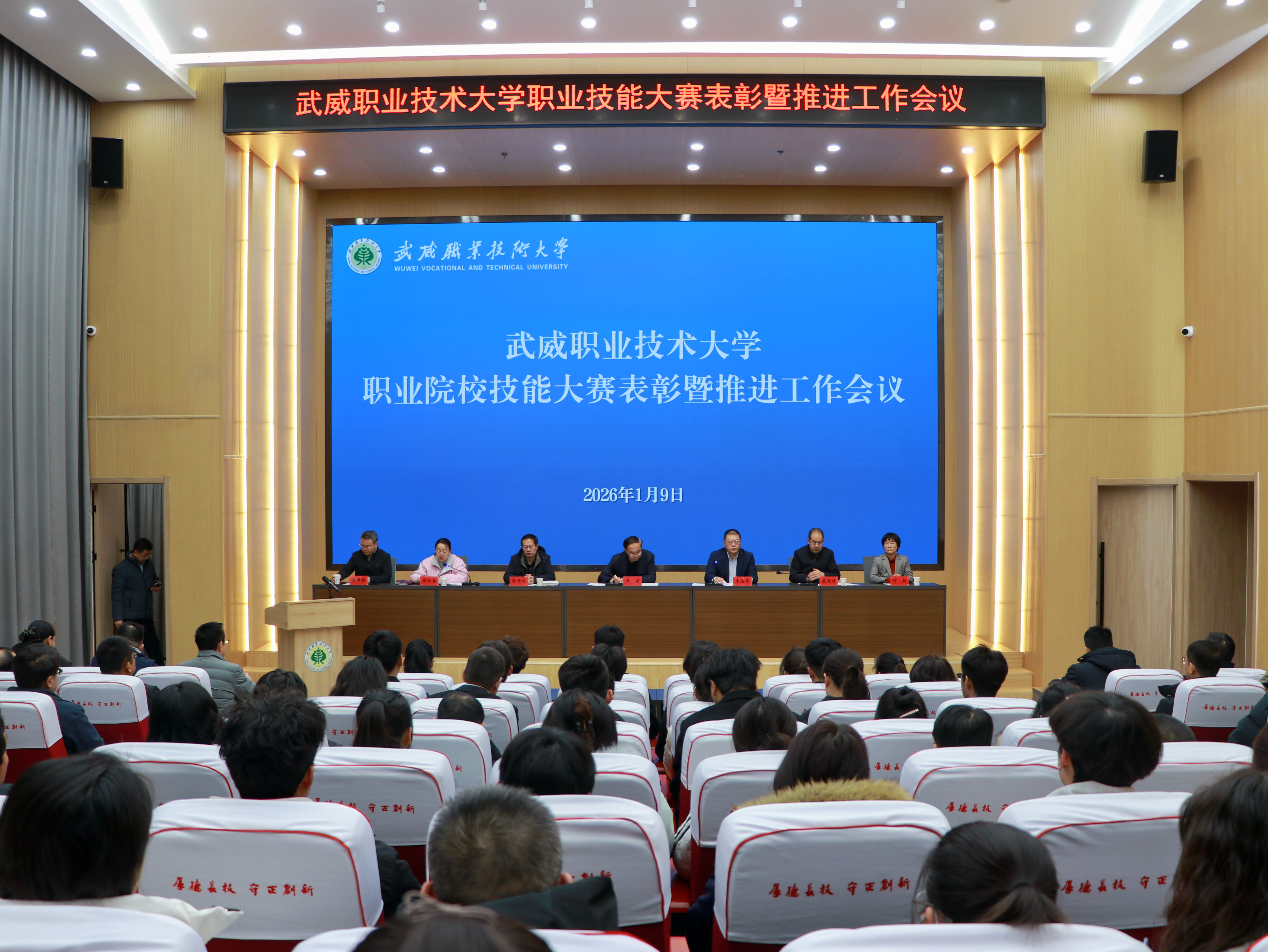 1月9日,武威職業技術大學召開職業院校技能大賽表彰暨推進工作會議。黨委書記王宏出席會議并講話。在家校領導班子成員、各學院(部)及職能部門負責人、獲獎師生代表以及備戰2026年大賽的師生代表共同參會。校長李海軍主持會議。