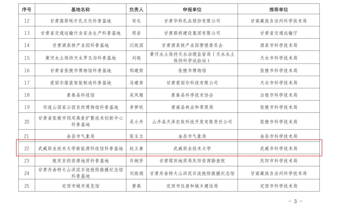 為深入貫徹國家創(chuàng)新驅(qū)動發(fā)展戰(zhàn)略,服務(wù)“雙碳”目標,由武威職業(yè)技術(shù)大學中科低碳新能源技術(shù)學院作為主體單位申報、學校科技處積極引導(dǎo)和扶持科普能力建設(shè)的甘肅省“武威職業(yè)技術(shù)大學新能源科技館科普基地”成功獲批,標志著我校在新能源科普教育、科研創(chuàng)新與社會服務(wù)方面邁上新臺階。