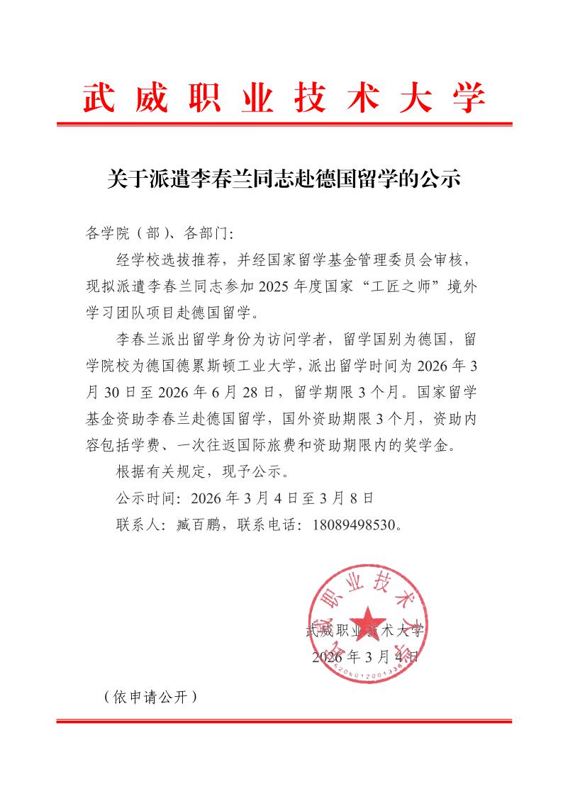 關于派遣李春蘭同志赴德國留學的公示