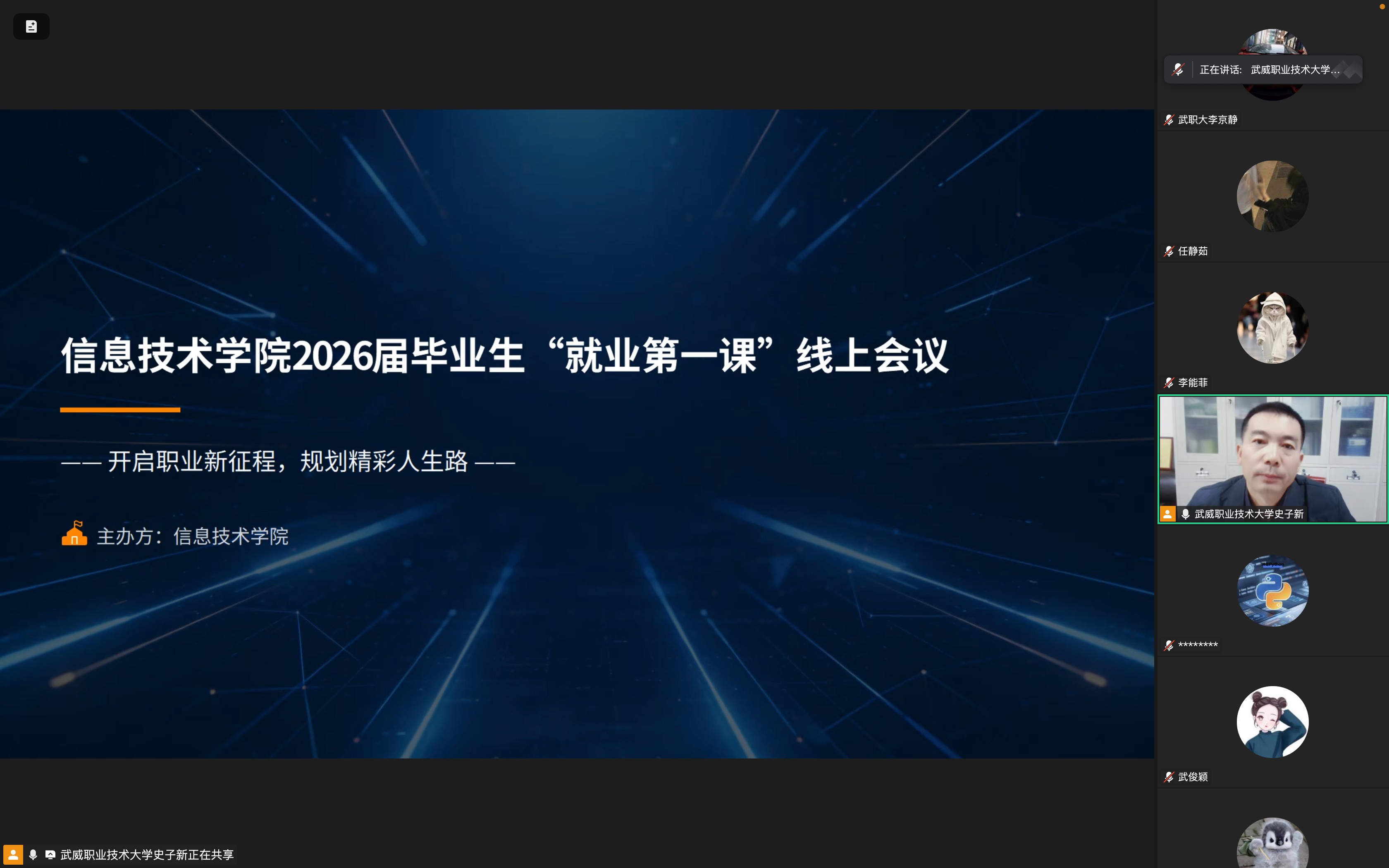 為深入貫徹落實高校“寒假促就業暖心行動”工作要求,切實做好2026屆畢業生就業指導服務,幫助實習階段的畢業生明晰職業方向、提升求職競爭力,3月5日,信息技術學院黨總支書記史子新通過“線下會場+線上同步直播”的形式,為全體2026屆畢業生及畢業班班主任開展了題為“開啟職業新征程,規劃精彩人生路”的“就業第一課”專題講座。