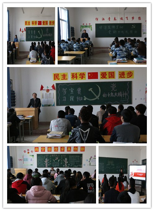 系黨總支書記、16級農村能源與環境技術大專班聯系黨員黃文源在黨課中以黨的十九大的主題、五年來的成就、我國社會主要矛盾的轉化、習近平新時代中國特色社會主義思想等方面對十九大精神進行了全方位的解讀和剖析;17級光伏發電技術及應用大專一、二班聯系黨員郭必寶從全面從嚴治黨、新時代黨的建設總要求、全面依法治國的角度進行了宣講,16級光伏材料大專班聯系黨員張娟主要為學生講解了十九大報告的政治成果、理論成果和實踐成果,16級光伏發電技術及應用大專班聯系黨員張國祥以十九大報告為主題,向學生講解了我們要舉什么樣的旗、走什么樣的路,以什么樣的精神狀態,擔負什么樣的歷史使命,實現什么樣的奮斗目標,16級太陽能光熱技術及應用大專班聯系黨員高海鵬從如何學習貫徹黨的十九大精神、如何學懂、弄通、做實等方面為學生講解了學習貫徹十九大精神的具體措施和方法。