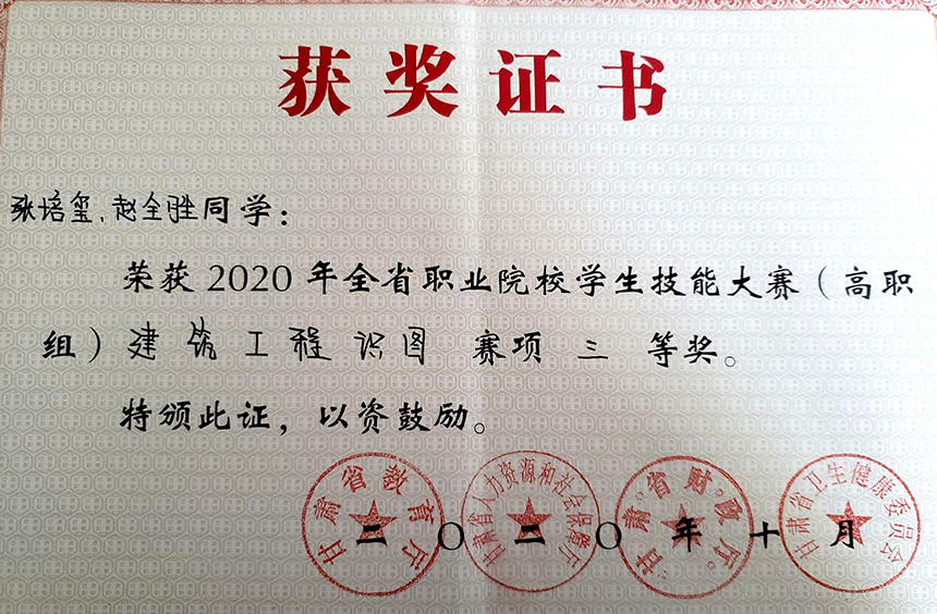 2020年全省職業院校學生技能大賽(高職組)建筑工程識圖賽項獲三等獎
