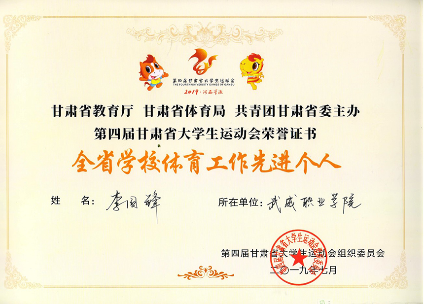 甘肅省教育廳甘肅省體育局共青團甘肅省委主辦第四屆甘肅省大學生運動會被評為“全省學校體育工作先進個人”