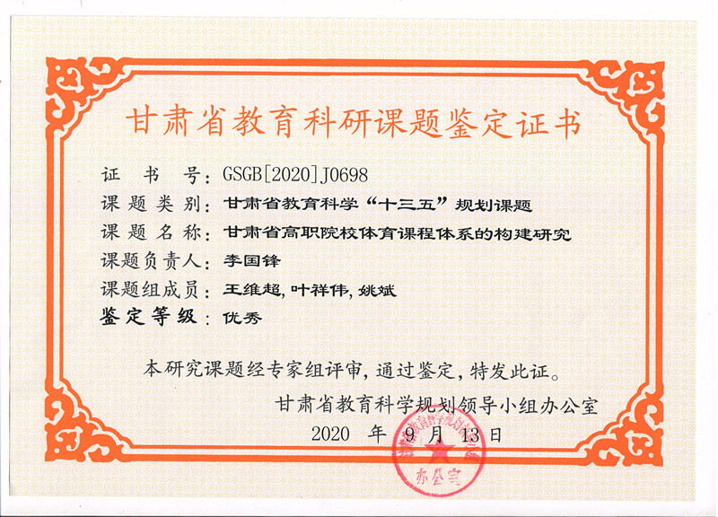 6.2020年項目組成員李國鋒完成甘肅省教育科學“十三五”規(guī)劃課題《甘肅省高職院校體育課程體系的構建研究》已結項獲優(yōu)秀獎 【鑒定證書】