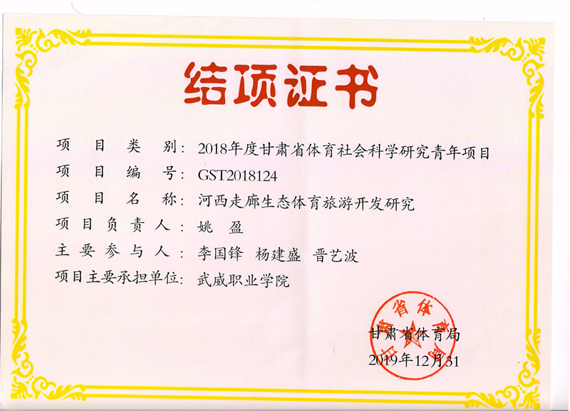 8.2019年項目組成員李國鋒參與完成甘肅省體育社會科學研究青年項目《河西走廊生態(tài)體育旅游開發(fā)研究》已結項 【結項證書】