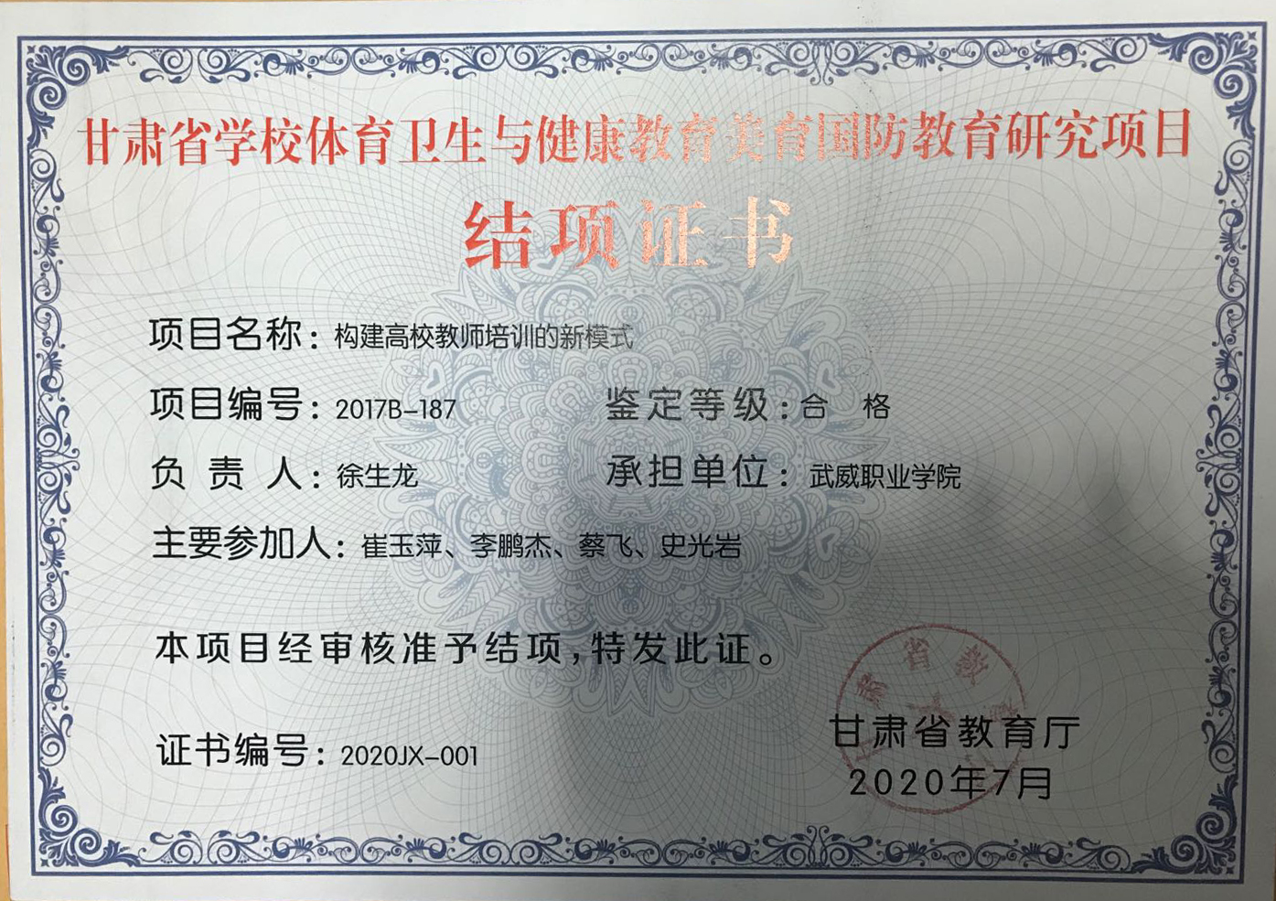 9.2020年項目組成員徐生龍主持完成甘肅省學校體育衛(wèi)生與健康教育美育國防教育研究項目《構建高校教師培訓的新模式》 結項 【結項證書】