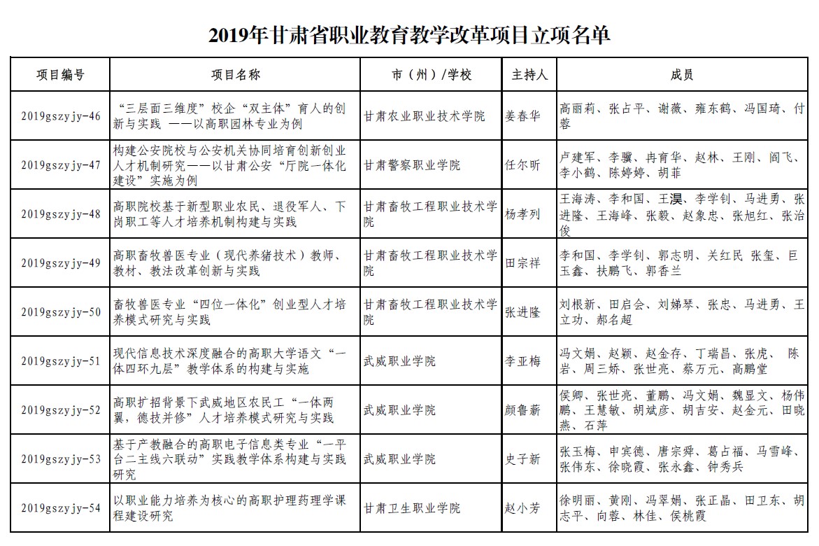 11.2019年項目組成員董鵬參加職業(yè)教育改革研究項目《高職擴招背景下武威地區(qū)農(nóng)民工“一體兩翼,德技并修”人才培養(yǎng)模式研究與實踐》結項【立項通知】 【立項名單】