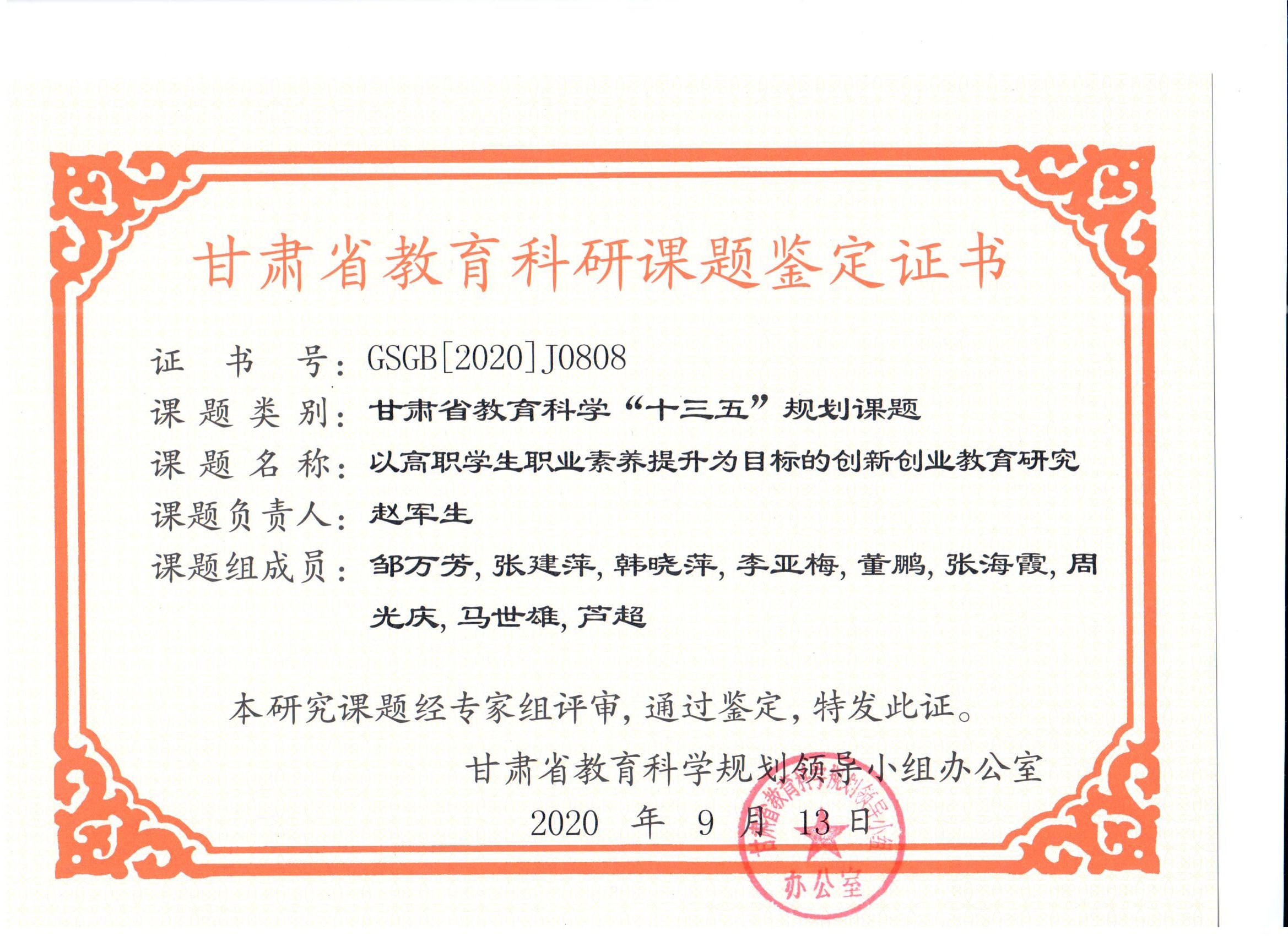 13.2020年項目組成員董鵬完成甘肅省教育科學“十三五”規(guī)劃課題《以高職學生職業(yè)素養(yǎng)提升為目標的創(chuàng)新創(chuàng)業(yè)教育研究》 結項 【鑒定證書】