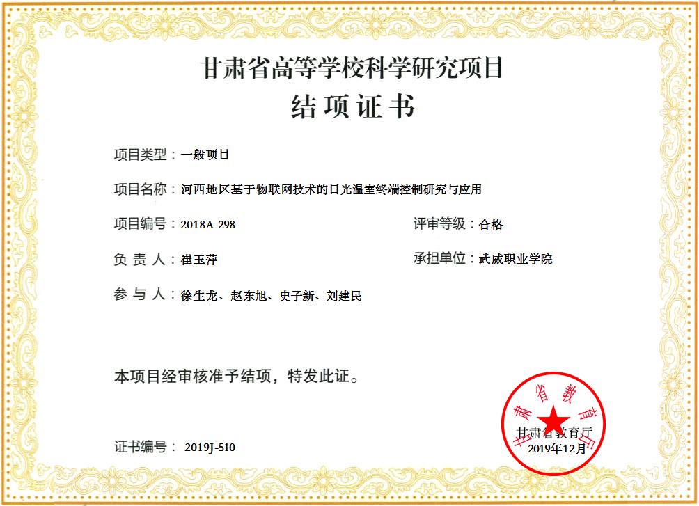 19.2019年項目組成員崔玉萍主持完成甘肅省高等學校科學研究項目《河西地區(qū)基于物聯(lián)網(wǎng)技術的日光溫室終端控制研究與應用》 結項 【結項證書】
