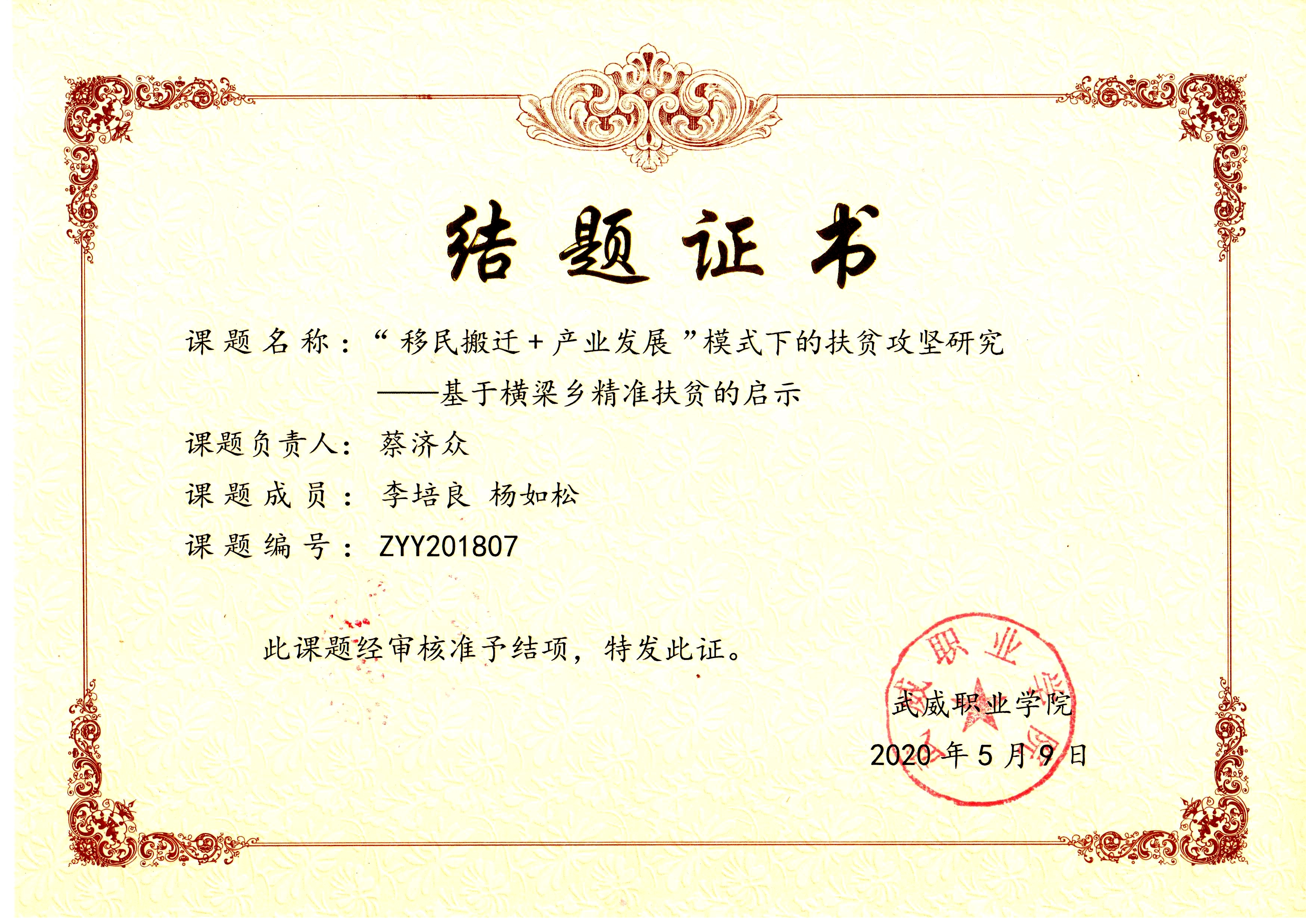 25.2020年項目組成員蔡濟眾主持完成院級科研項目《“移民搬遷+產(chǎn)業(yè)發(fā)展”模式下的扶貧攻堅研究--基于橫梁鄉(xiāng)精準扶貧的啟示》 結項 【結題證書】