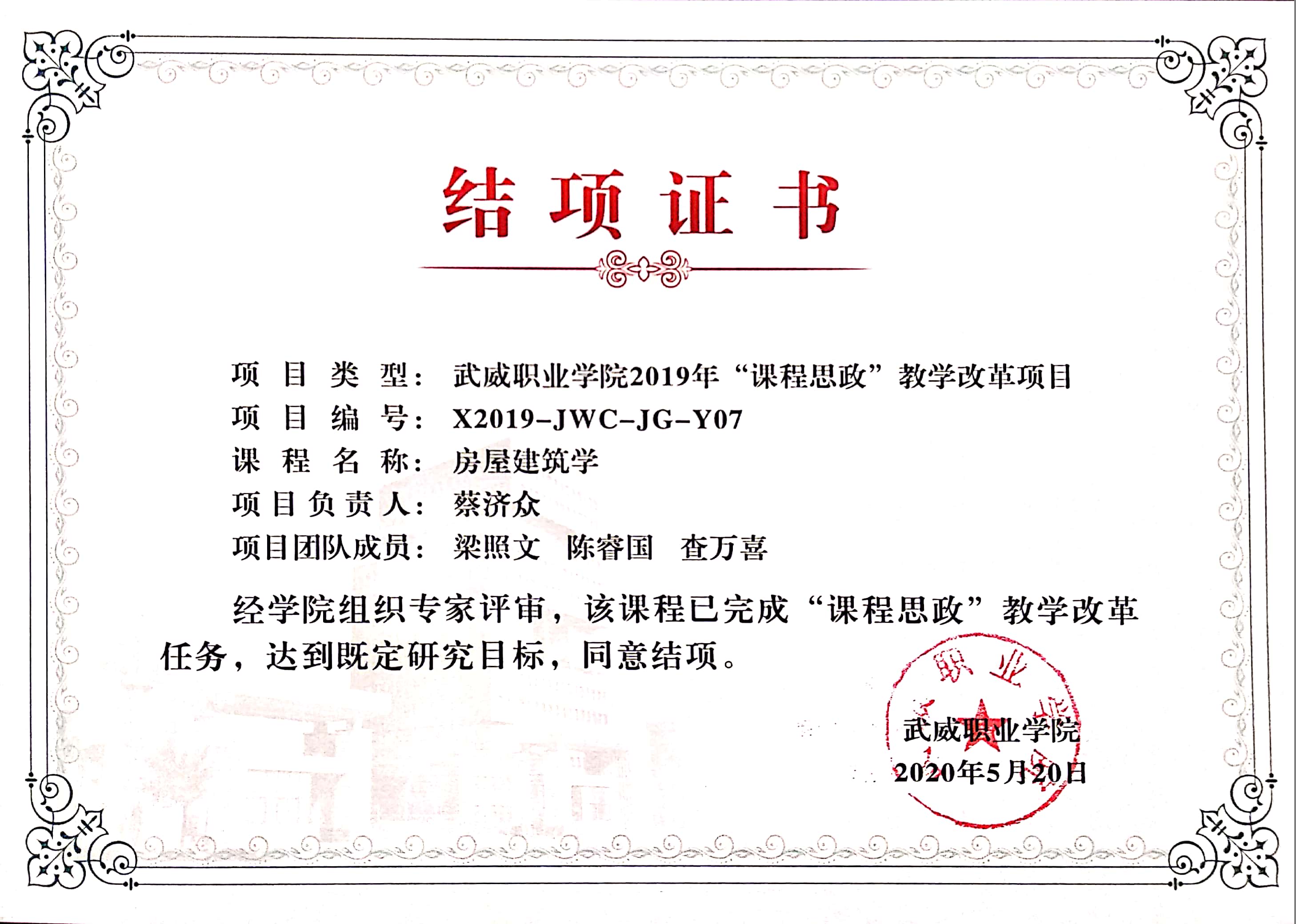 26.2020年項目組成員蔡濟眾、陳睿國主持完成《房屋建筑學》課程思政改革? 結項 【結項證書】