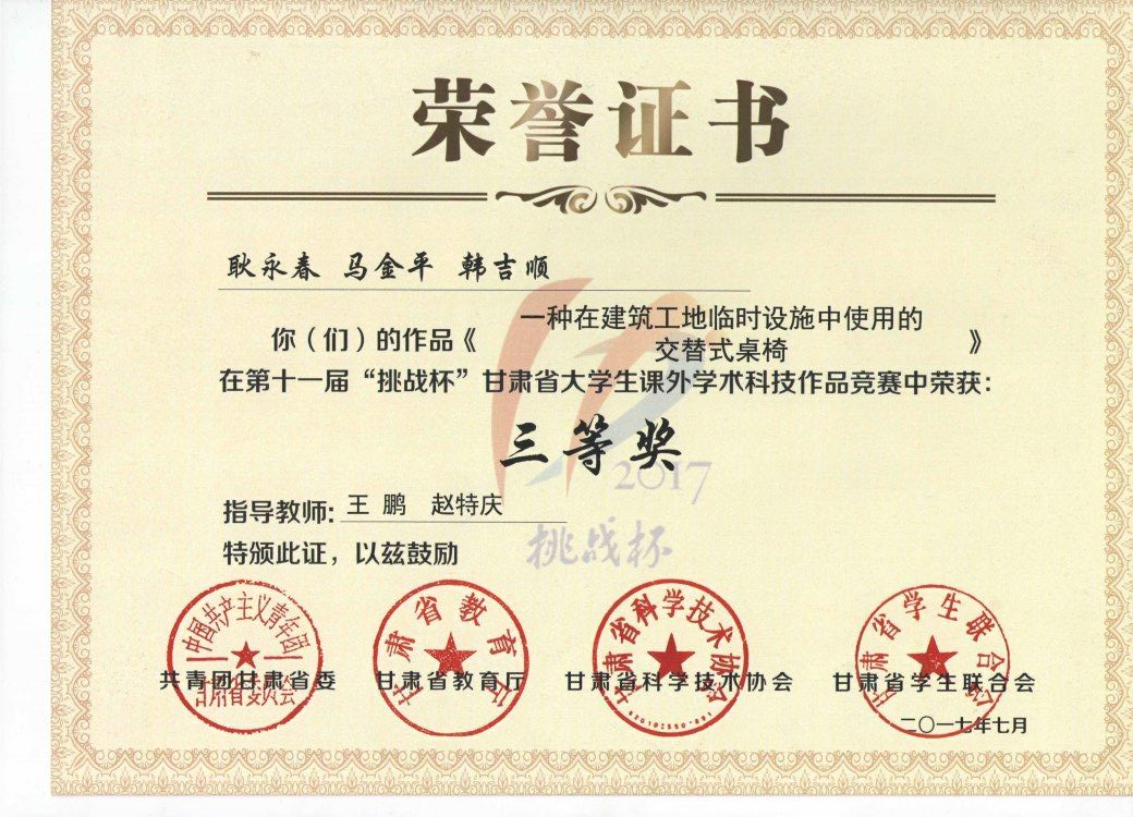 第十一屆“挑戰杯”甘肅省大學生課外學術科學作品《一種在建筑工地臨時設施中使用的交替式桌椅》